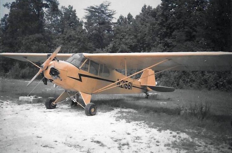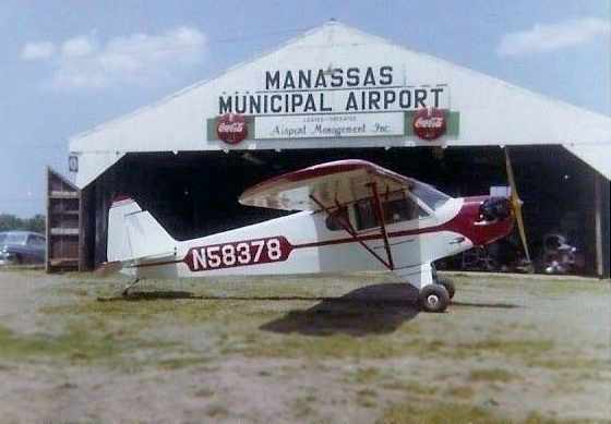 A 1962 photo by Paul Bombardier of a 1946 Piper J-3 Cub in front of the hangar at the original Manassas Airport.