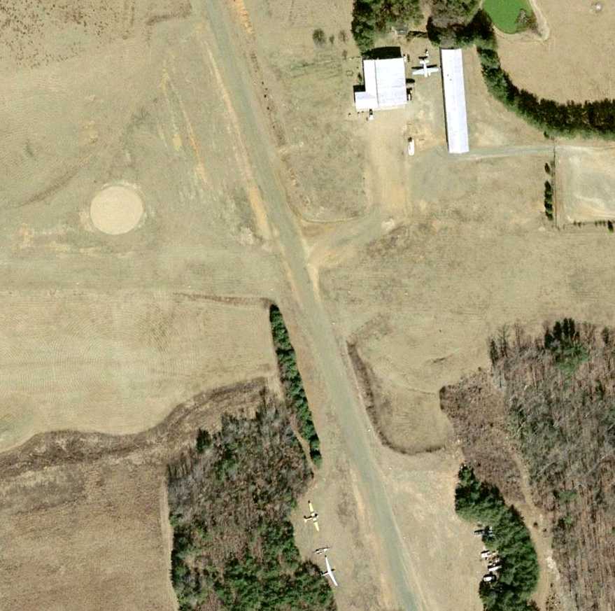 as having 2 unpaved runways, with 2 hangars & 22 aircraft on the west side of the field.