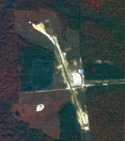as having 2 unpaved runways, with a hangar & 6 light aircraft on the west side of the field.