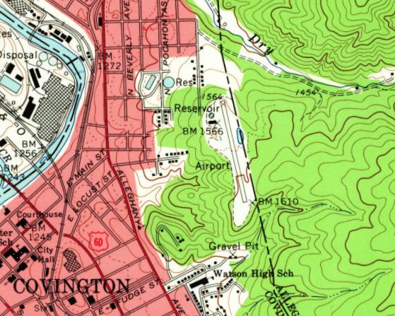 The earliest topo map depiction which has been located of Covington Airport was on the 1964 USGS topo map.
