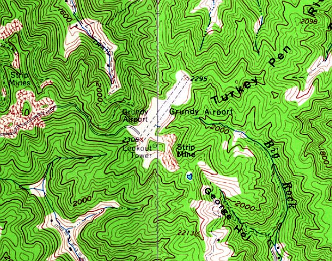 The 1977 USGS topo map continued to depicted Grundy Airport as having a single unpaved northeast/southwest runway,
