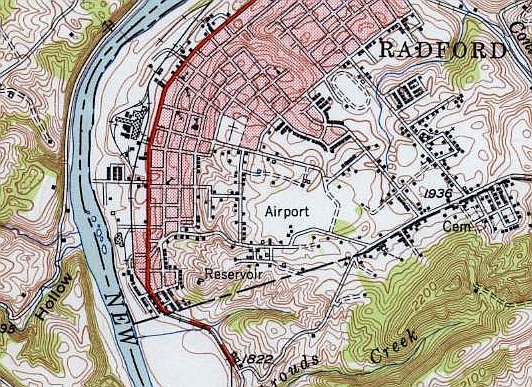 The 1950 USGS topo map depicted Radford Airport as a small open area in the southwest part of the town, generically labeled as “Airport”.