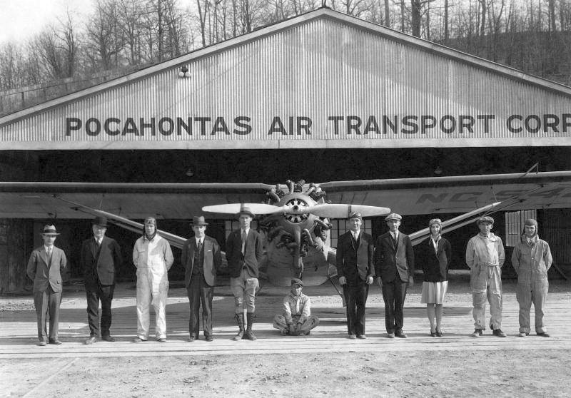 An undated (circa 1920s-30s) photo of the staff of Pocohontas Air Transport Corporation & 3 aircraft in front of their hangar at Bluefield Municipal Airport (courtesy of Rick Harshbarger).