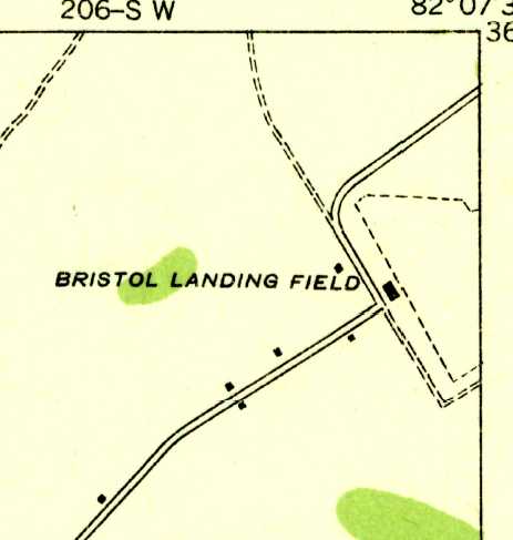The 1960 USGS topo map continued to depict “Bristol Landing Field” as an irregularly-shaped outline with a single building at the west side.