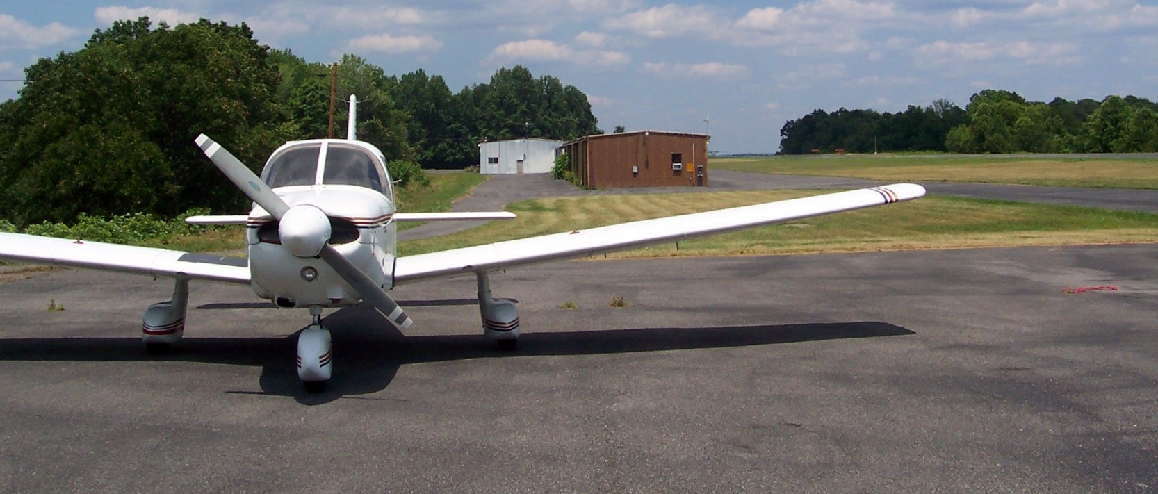 A 7/2/08 photo of a Piper Warrior in front of the Grundy Municipal Airport hangars.