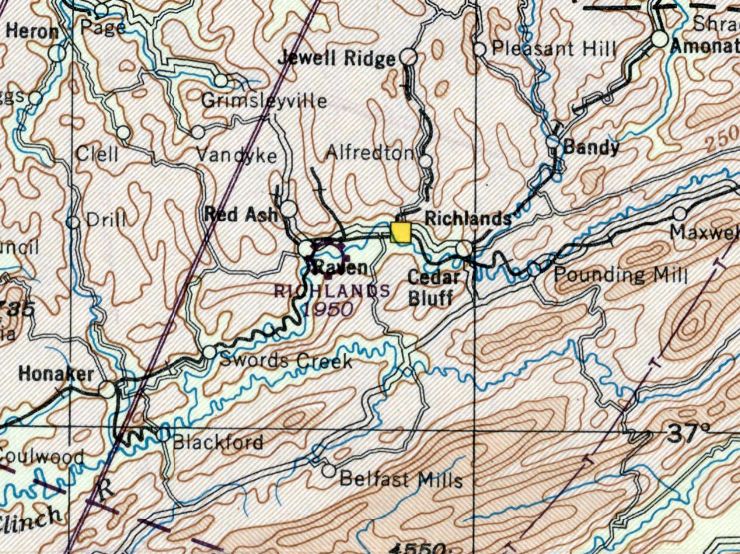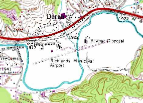 The 1950 USGS topo map depicted Richlands Airport as having a single unpaved northeast/southwest runway.