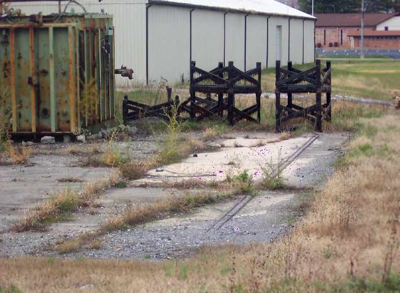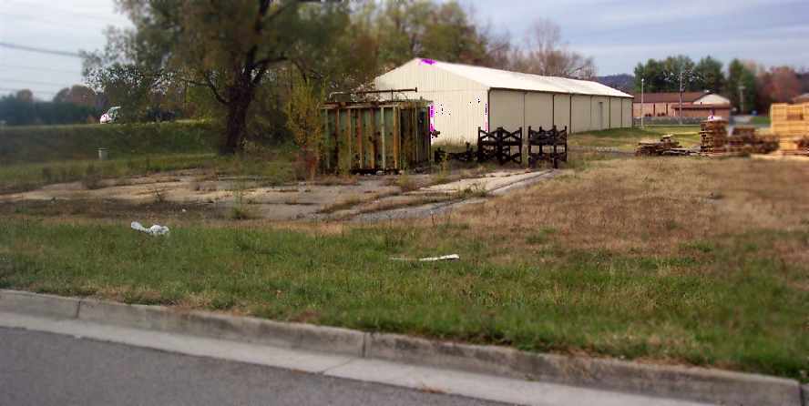 A July 2012 photo looking north at a shed on the northeast side of the Radford Airport site which may be a former T-hangar.