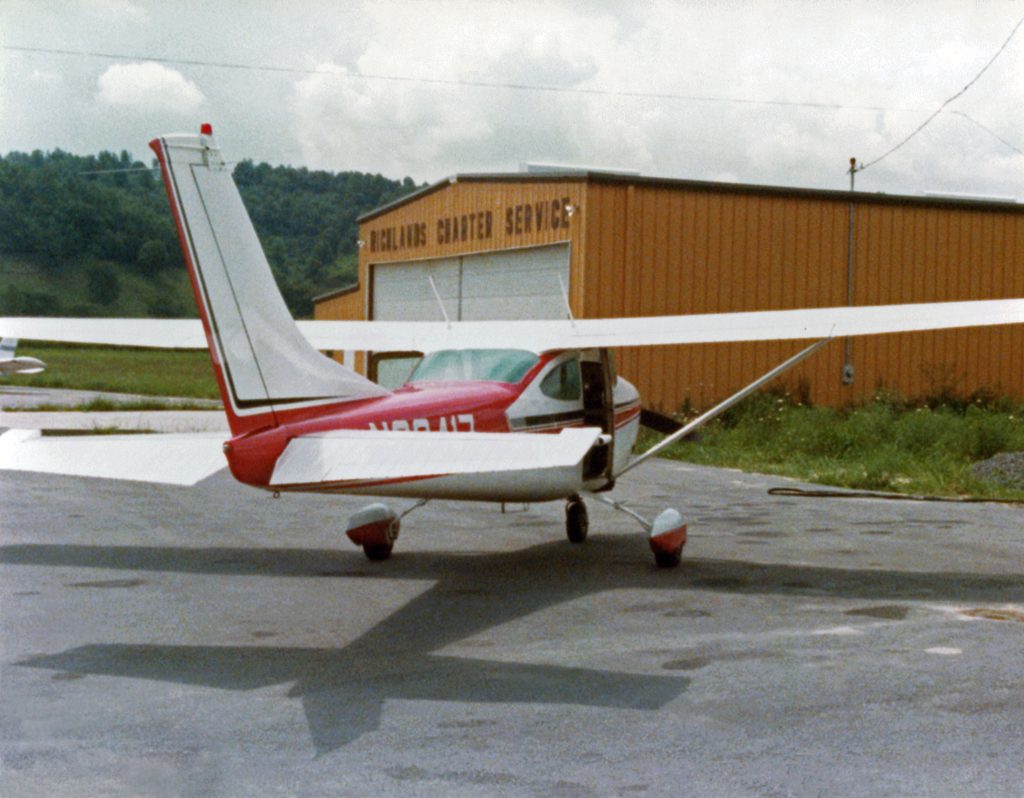 An 8/12/77 photo By Kenneth Keeton of a Cessna 1982 in front of the Richlands Charter Service hangar.