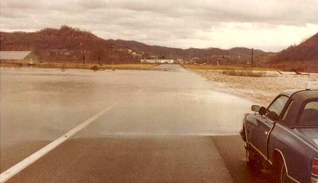 A 1981 photo by Frank White of floodwaters over the runway at Richlands Municipal Airport.