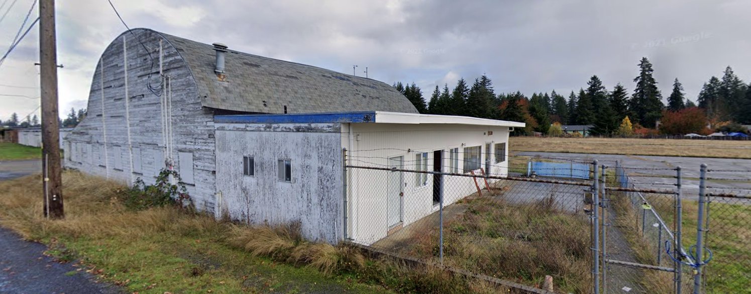 A circa 2013 photo by Anthony Tessitore looking south at Spanaway Airport's hangars on the northwest corner.