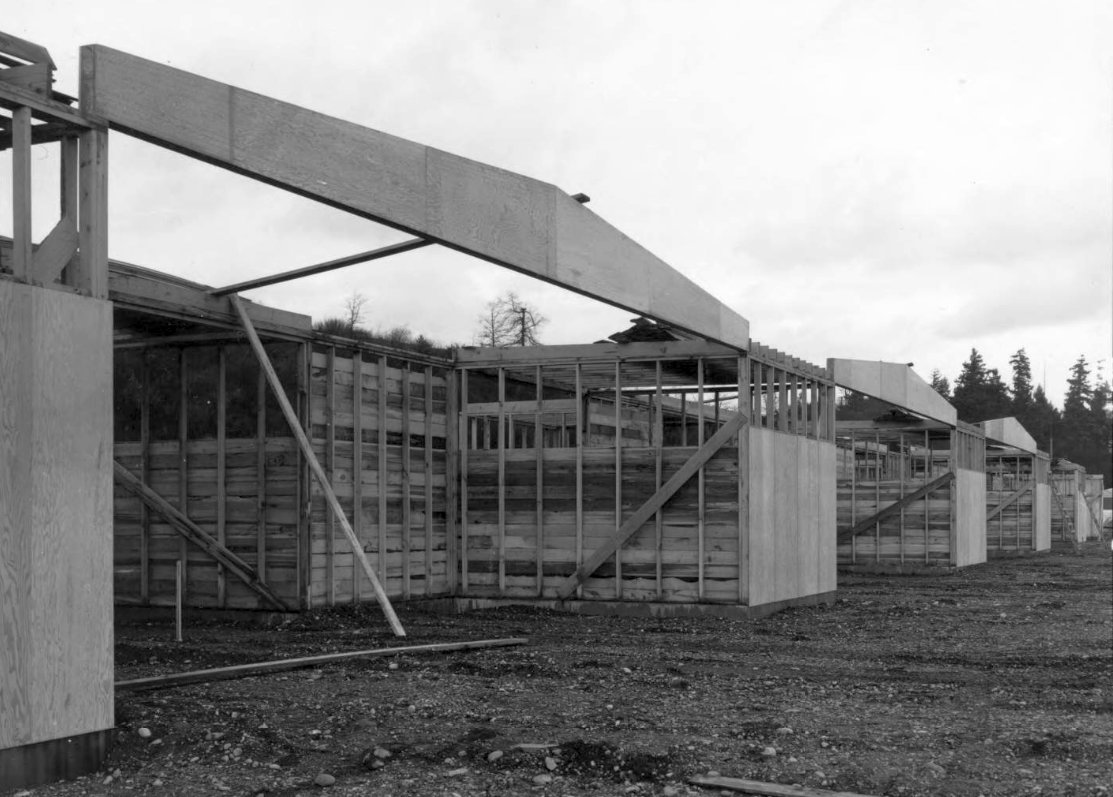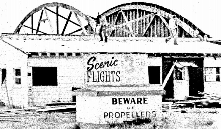 These are believed to be some of the 10 new T-hangars built by C.E. Munson, contractor, which held 5 planes to a side.