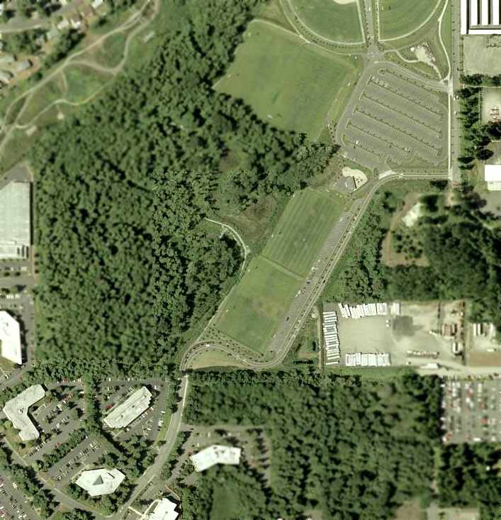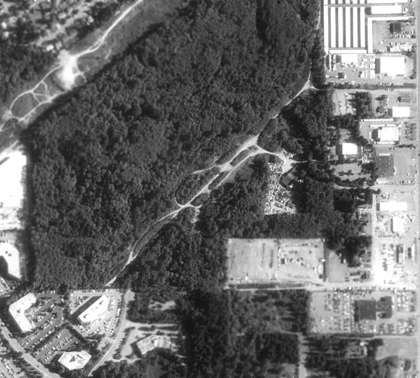In a 1990 aerial photo of the site of South Tacoma Airport, remains of the former runway pavement were still barely visible.