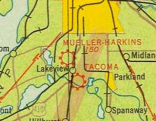 A 1954 street map (courtesy of Kevin Walsh) depicted “Tacoma Airpark” as a north/south-oriented rectangular property outline.