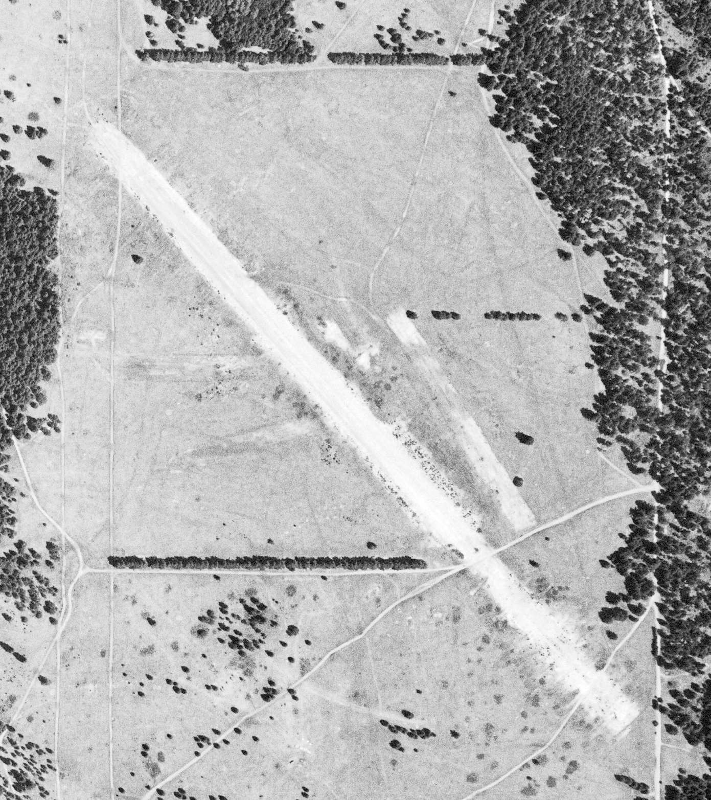 with all of the airport buildings except one having been removed, and the outline of the runways still somewhat recognizable.