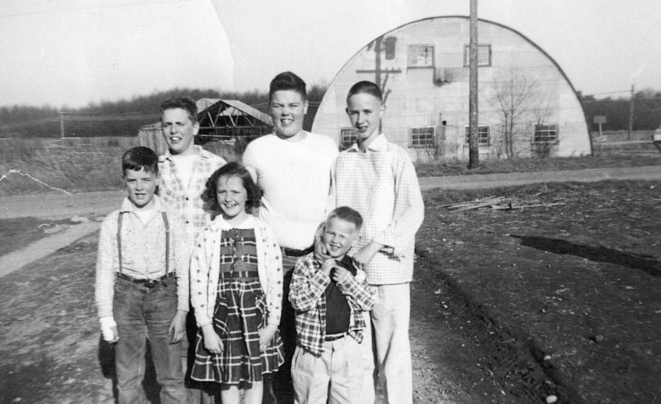 A 1955 photo of Larry Clark & other children in front of the City View Airport hangars.