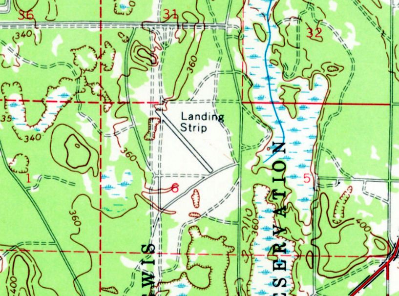 The 1961 USGS topo map depicted Spanaway Airport as as a north/south unpaved runway, labeled generically as “Landing Strip”, with a few small buildings on either side.