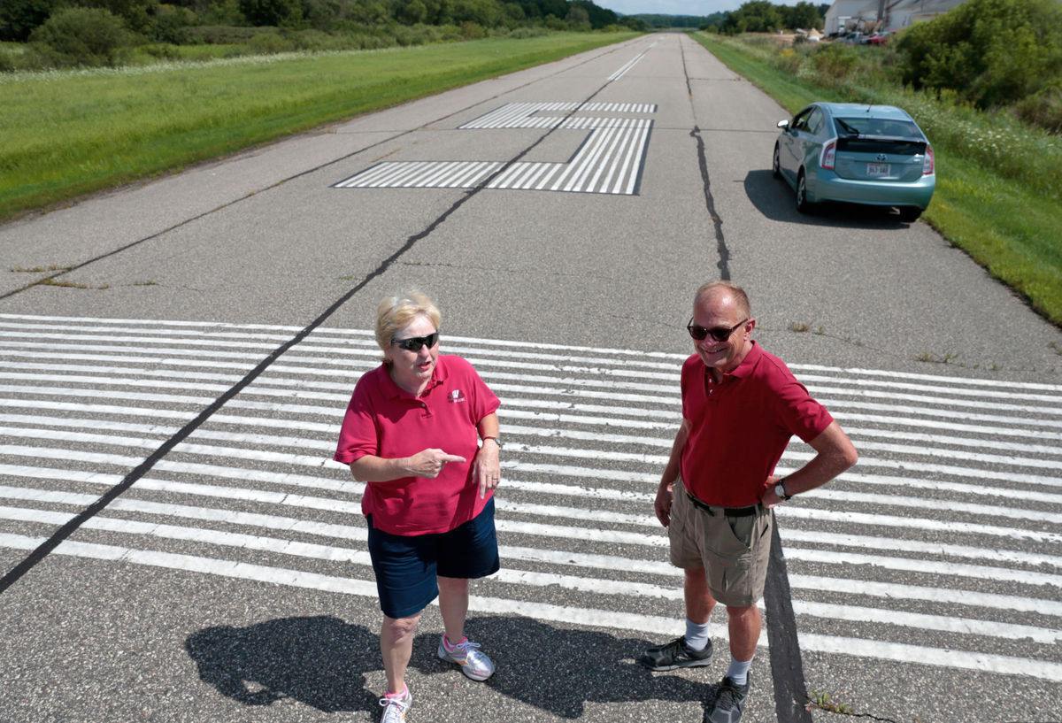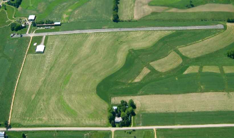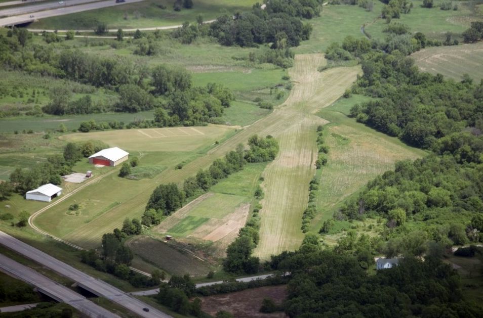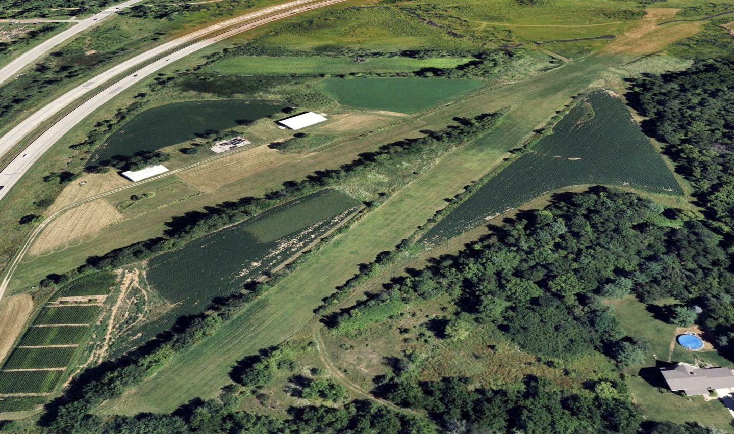 A 2013 aerial view looking northwest at the former Dodgeville Airport shows the runway to remain intact,