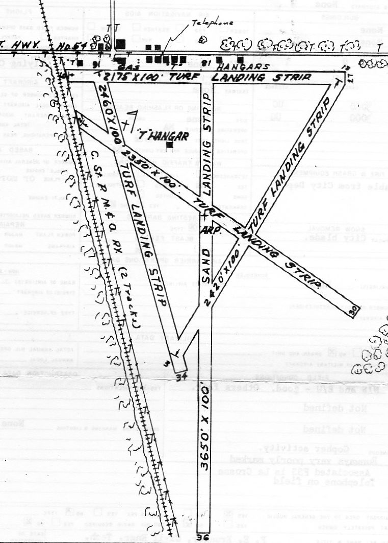 It depicted “Sparta Landing Field” as occupying a triangular patch of land, with 3 small buildings on the northwest corner.
