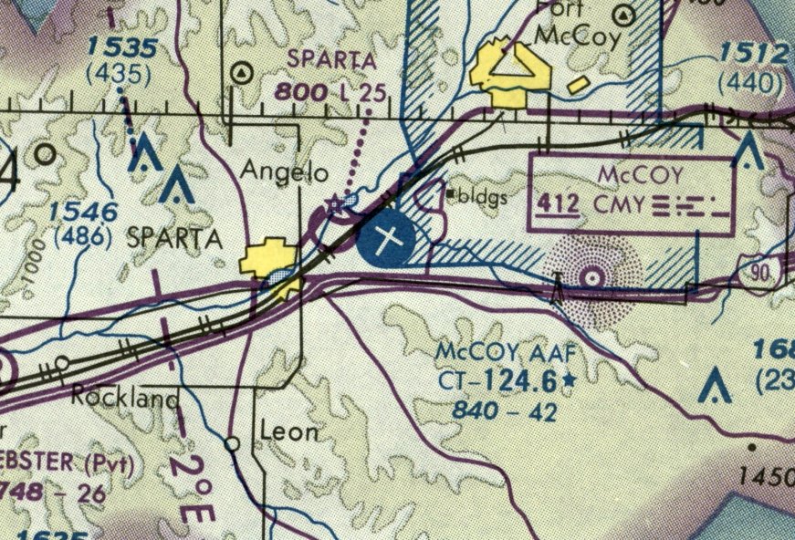 It depicted Sparta-Angelo Airport as a commercial/municipal airport, with the Camp McCoy Auxiliary military airfield directly across the railroad tracks to the southeast.