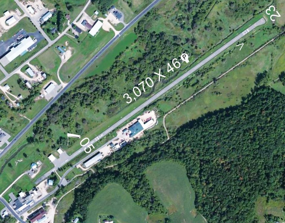 A 2023 photo looking northeast at Verona Airport's hangars & Runway 5.