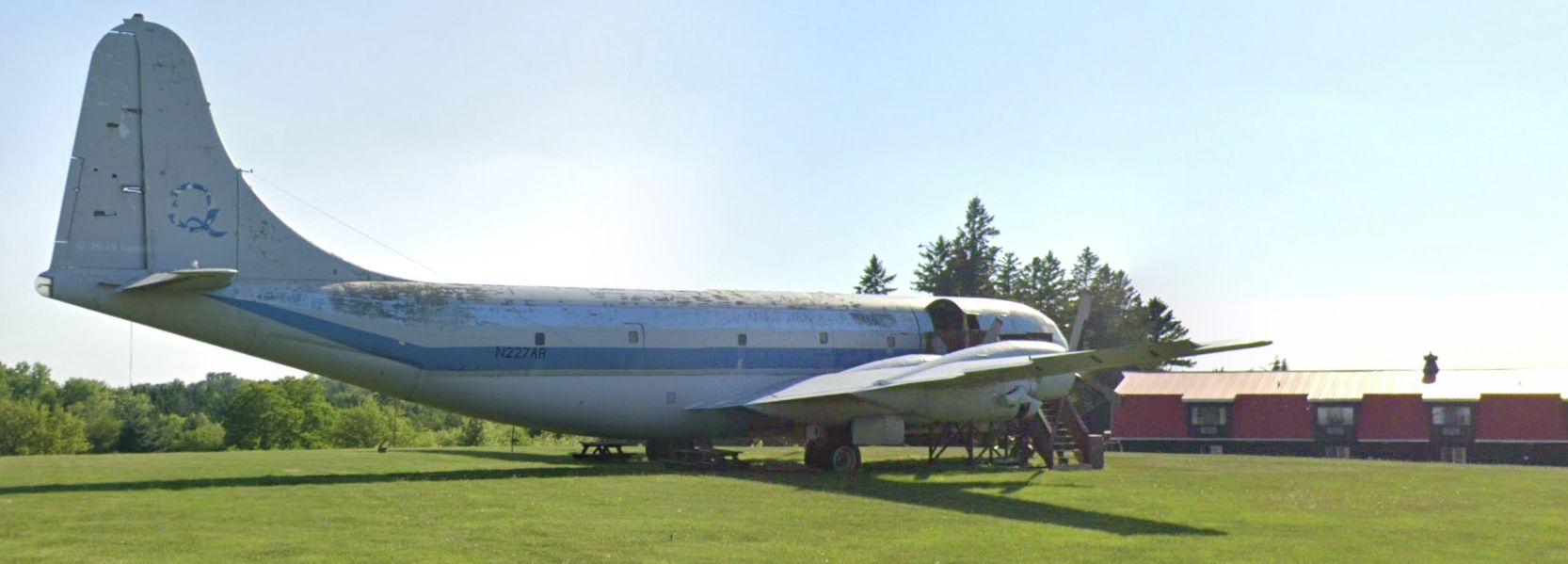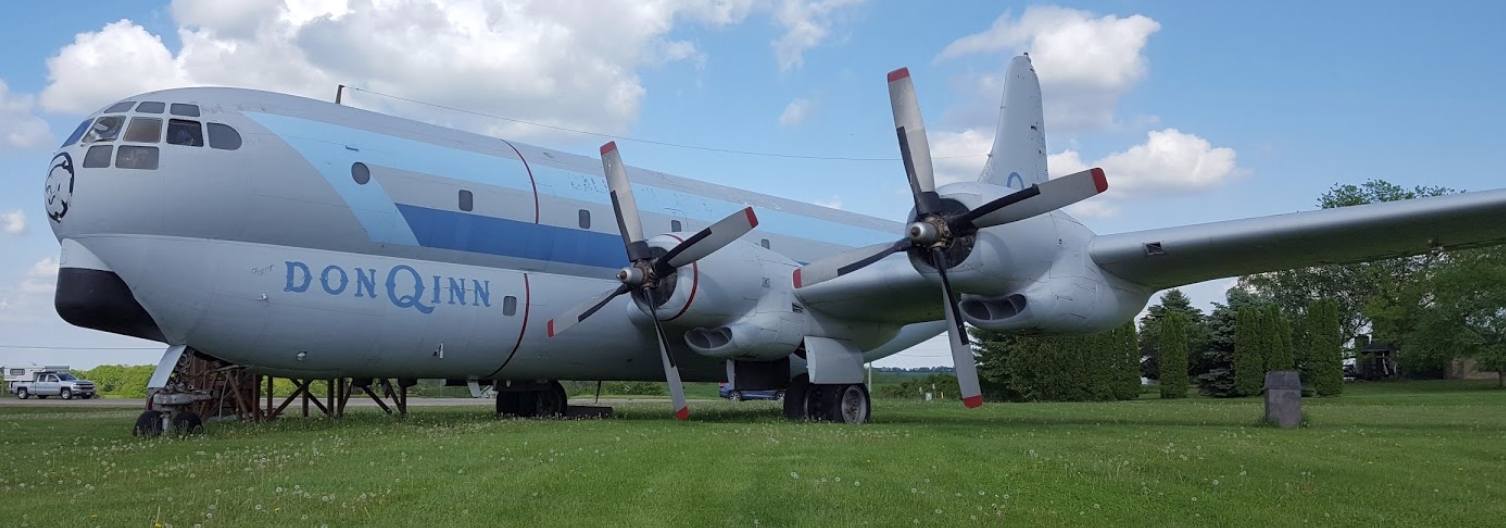 A 2023 photo looking west at the C-97G in front of the Don Q Inn, adjacent to the south side of the former Dodgeville Municipal Airport.