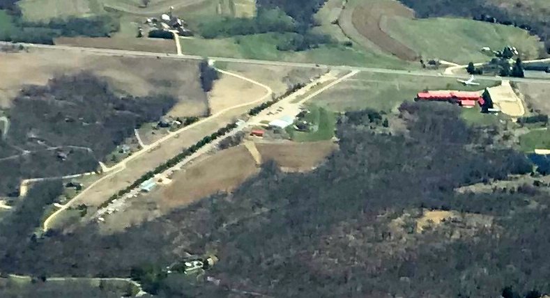 A 4/27/18 aerial view by Ron Plante looking east at the former Dodgeville Airport shows the runway to remain intact,
