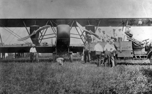 A 1920 photo of a twin-engine biplane (model unidentified) at Salzer Field (from the La Crosse Public Library, courtesy of Joe Farwell).