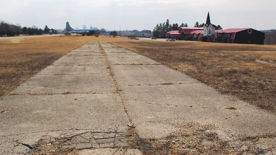 A 2009 photo by Jason McDowell looking south along Dodgeville's former north/south taxiway leading to the C-97, with the Don Q Inn on the right.