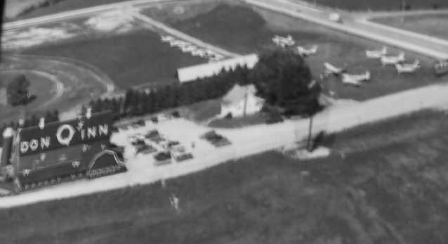 An undated aerial view of several light planes parked next to the Don Q Inn at Dodgeville Airport